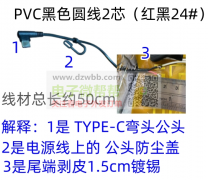 PVC黑色圆线2芯(红黑24#),急需15000条!线材总长约50cm,解释:1是TYPE-C弯头公头2是电源线上的公头防尘盖3是尾端