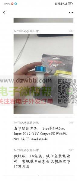 帮我找这款的配件17万个。看下这款车充,尺寸:6.5*4.2厘米,输入:DC12—24V 0输出:直流5V+5%最大值:/A,内置集成电路板,做纸板,1A电流,做吸卡包装,常规返单的东西大概每次下17万左右