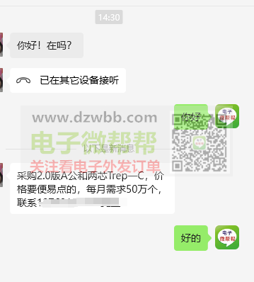 采购2.0版A公和两芯Trep一C,每月各需50万个!价格要便易点的,优势厂商请联系我