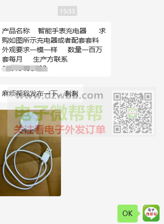 采购智能手表充电器或者配套套料 ,月用量100万!