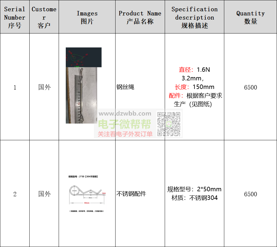 采购钢丝绳和不锈钢配件,数量各6500个!材质:不锈钢304,规格按图片图纸,出口印度。要求:供应商有跟外贸公司合作和出口经验的,可以收美金,请报FOB/USD美金/人民币EXW价格,感兴趣的生产厂家或代理商请+V:(非手机号,10位数),中间商勿扰