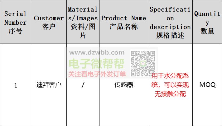 传感器厂家速来对接,出口迪拜!用途:用于水分配系统,可以实现无接触分配,新项目处于开发阶段,无具体的规格参数信息,网址:www.mahawa.ae,需供应商根据用途推荐合适的产品目录或报价表,便于选型,出口迪拜。要求:供应商有跟外贸公司合作和出口经验的,可以收美金且能报关,请优先按顺序报含报关FOB离岸美金价/人民币含税价/未税价,符合要求并感兴趣生产厂家请+V:(非手机号,10位数),中间商勿扰。