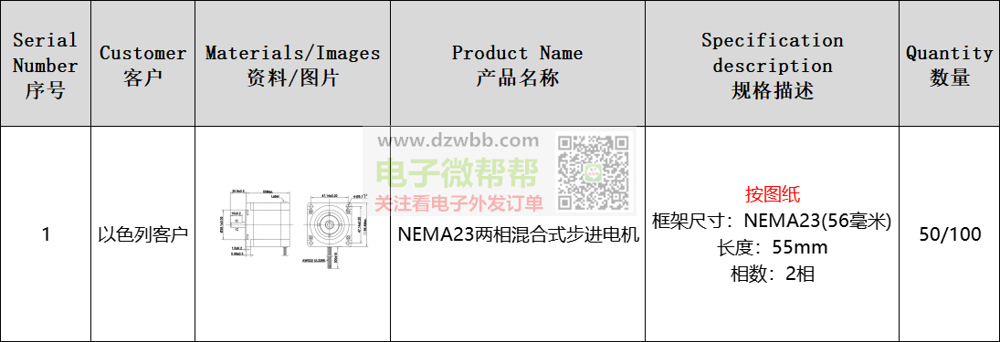 NEMA23两相混合式步进电机厂家请联系,出口以色列!长度:55mm,数量:首单50/100,长期采购,要求:供应商有跟外贸公司合作和出口经验的,可以收美金且能报关,请优先按顺序报含报关FOB离岸美金价/人民币含税价/未税价,符合要求并感兴趣生产厂家请+V:(非手机号,10位数),中间商勿扰。
