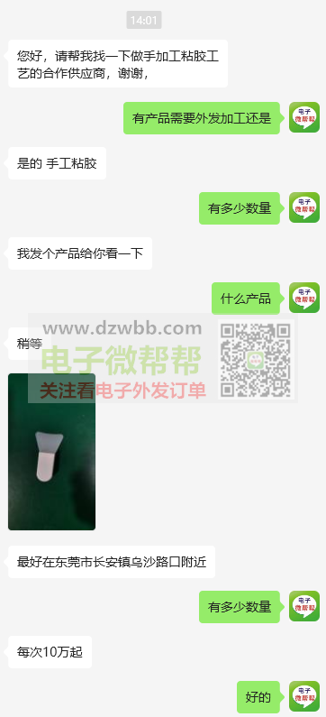 外发:手工粘胶,每次100000套起! 最好是在东莞市长安镇乌沙路口附近的