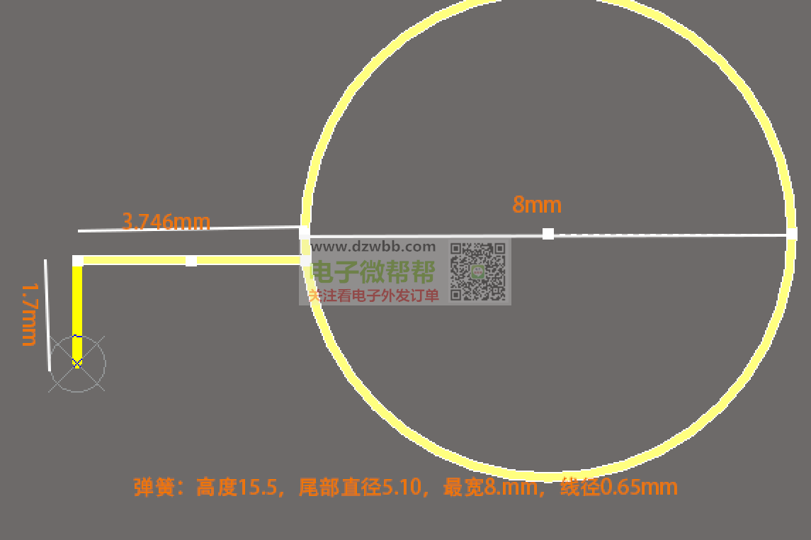 订单100000个,如图手电筒弹簧!材质弹簧钢,并打样确认,弹簧:高度15.5,尾部直径5.10,最宽8mm,线径0.65mm