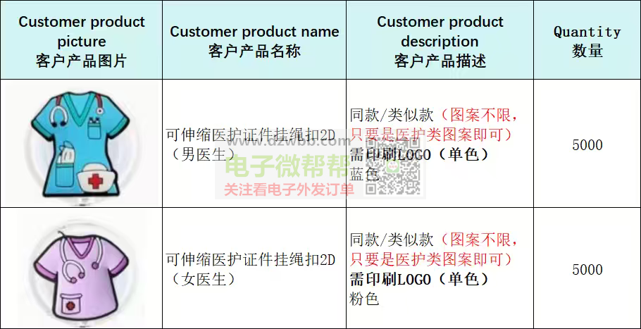 2款可伸缩医护证件挂绳扣2D,各5000个!或推荐类似款,材质和款式不限(只要是医护类图案即可),需印刷LOGO(单色),数量:各5000个,出口国外。要求:供应商有跟外贸公司合作和出口经验的,可以收美金且能报关,请优先按顺序报含报关FOB离岸美金价/人民币含税价,符合要求的生产厂家请+V:(非手机号,10位数),中间商勿扰。