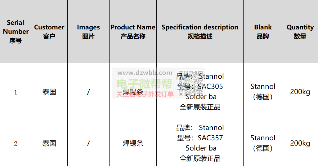 品牌:Stannol(德国),型号:SAC305和SAC357,,全新原装正品,出口泰国。要求:供应商有跟外贸公司合作和出口经验的,可以收美金且能报关,请优先按顺序报含报关FOB离岸美金价/人民币含税价,符合要求的代理或经销商请+V:(非手机号,10位数),中间商勿扰。
