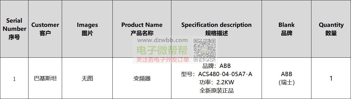 品牌:ABB,型号:ACS480-04-05A7-A,,全新原装正品,出口巴基斯坦。要求:供应商有跟外贸公司合作和出口经验的,可以收美金且能报关,请优先按顺序报含报关FOB离岸美金价/未税价格,符合要求的代理商和经销商请+V:(非手机号,10位数),中间商勿扰