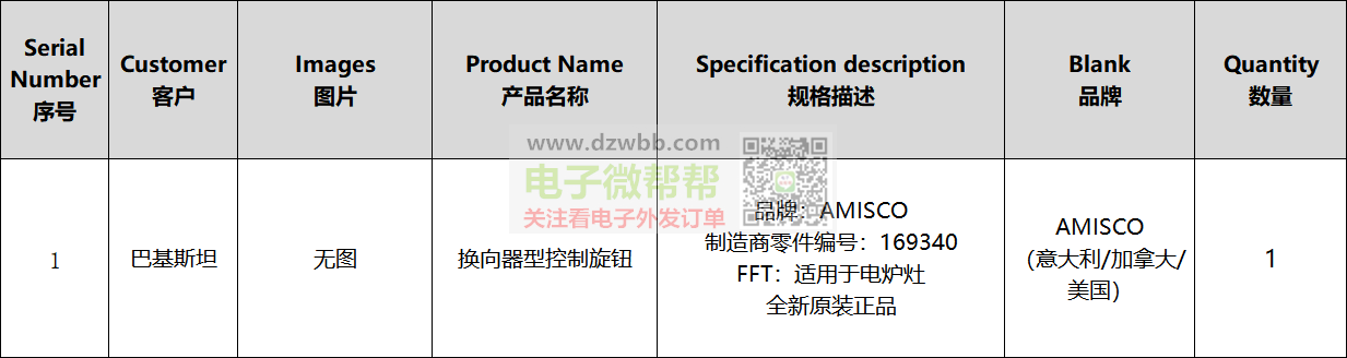 换向器型控制旋钮厂家请联系!有AMISCO品牌换向器型控制旋钮的采购需求,品牌:AMISCO,零件编号:169340,数量:1个,适用于电炉灶,全新原装正品,出口巴基斯坦。要求:供应商有跟外贸公司合作和出口经验的,可以收美金且能报关,请优先按顺序报含报关FOB离岸美金价/未税价格,符合要求的代理商和经销商请+V:(非手机号,10位数),中间商勿扰