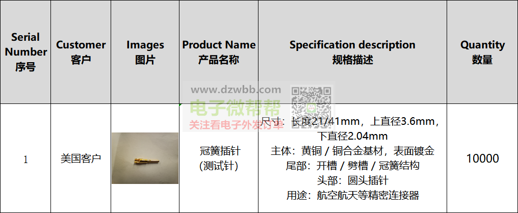 冠簧插针(测试针),订单:10000个!