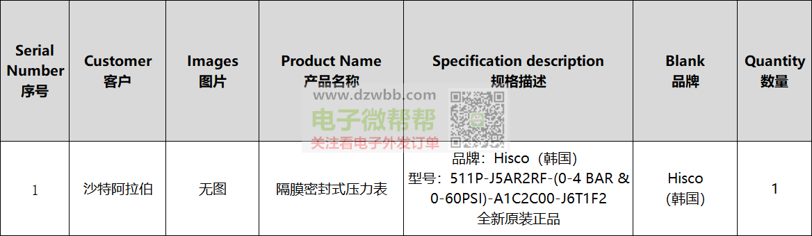 Hisco品牌隔膜密封式压力表的采购需求,品牌:Hisco,型号:511P-J5AR2RF-(0-4 BAR & 0-60PSI)-A1C2C00-J6T1F2,数量:1,全新原装正品,出口沙特阿拉伯。要求:供应商有跟外贸公司合作和出口经验的,可以收美金且能报关,请报在香港交货的EXW美金价或RMB未税价格,符合要求代理商或经销商请+V:(非手机号,10位数),中间商勿扰。