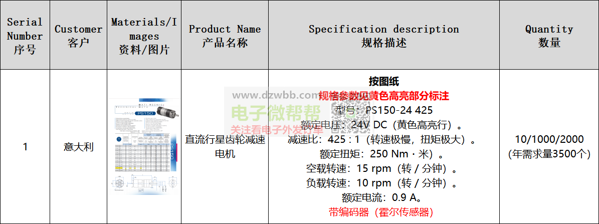 直流24V,规格参数见图纸的黄色部分,减速比:425 : 1(转速极慢,扭矩极大),额定扭矩:250 Nm・米),空载转速:15 rpm(转 / 分钟),负载转速:10 rpm(转 / 分钟)。数量:10/1000/2000,出口意大利。要求:供应商有跟外贸公司合作和出口经验的,可以收美金且能报关,请优先按顺序报含报关FOB离岸美金价/含税价格,符合要求的生产厂家请+V:(非手机号,10位数),中间商勿扰