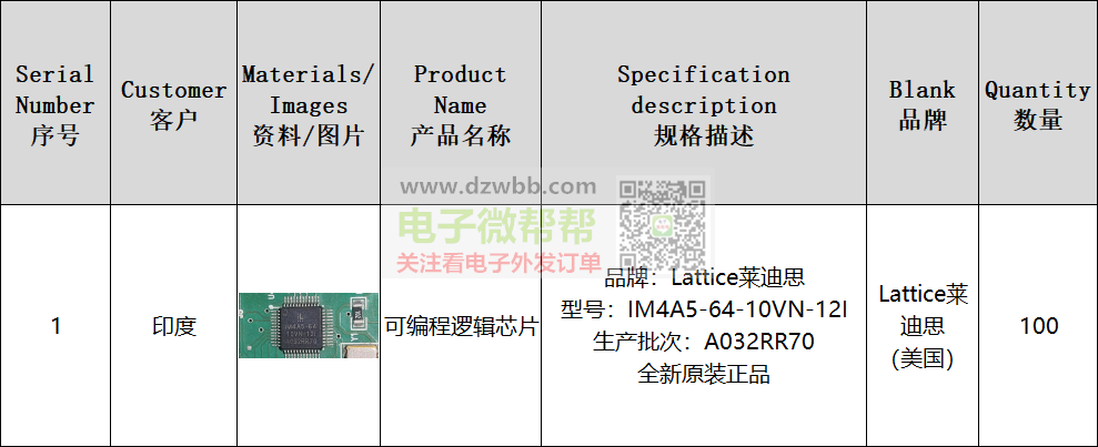 品牌:Lattice莱迪思(美国),型号:IM4A5-64-10VN-12I,全新原装正品 ,出口印度。要求:供应商有跟外贸公司合作和出口经验的,可以收美金且能报关,请报EXW美金价/RMB含税和未税价格,符合要求代理商或经销商请+V:(非手机号,10位数),中间商勿扰。