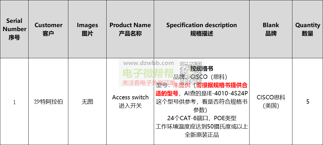 品牌:CISCO思科(美国),型号:未提供(需根据规格书提供合适的型号,AI查的是IE-4010-4S24P这个型号供参考,看是否符合规格书参数),数量:5,全新原装正品,出口沙特阿拉伯。要求:供应商有跟外贸公司合作和出口经验的,可以收美金且能报关,请报在香港交货的EXW美金价或RMB未税价格,符合要求代理商或经销商请+V:(非手机号,10位数),中间商勿扰。