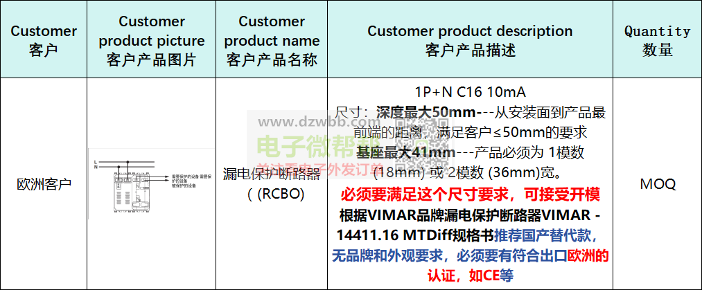 无品牌和外观要求,尺寸:深度最大50mm---从安装面到产品最前端的距离,满足客户≤50mm的要求,基座最大41mm---产品必须为 1模数 (18mm) 或 2模数 (36mm)宽。必须要满足这个尺寸要求,可接受开模,根据IMAR品牌漏电保护断路器VIMAR - 14411.16 MTDiff规格书推荐替代款,必须要有符合出口欧洲的认证。要求:供应商有跟外贸公司合作和出口经验的,可以收美金且能报关,请优先按顺序报含报关FOB离岸美金价/含税价格,符合要求的生产厂家请+V:(非手机号,10位数),中间商勿扰。