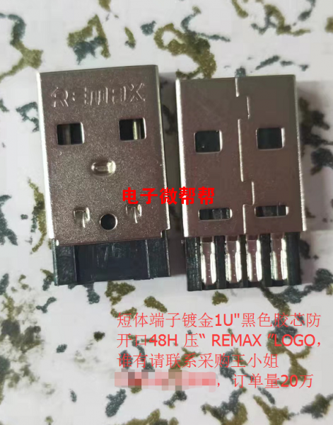 短体端子镀金1U”黑色胶芯防开口48H压“REMAX”LOGO,订单量20万,有意者请联系