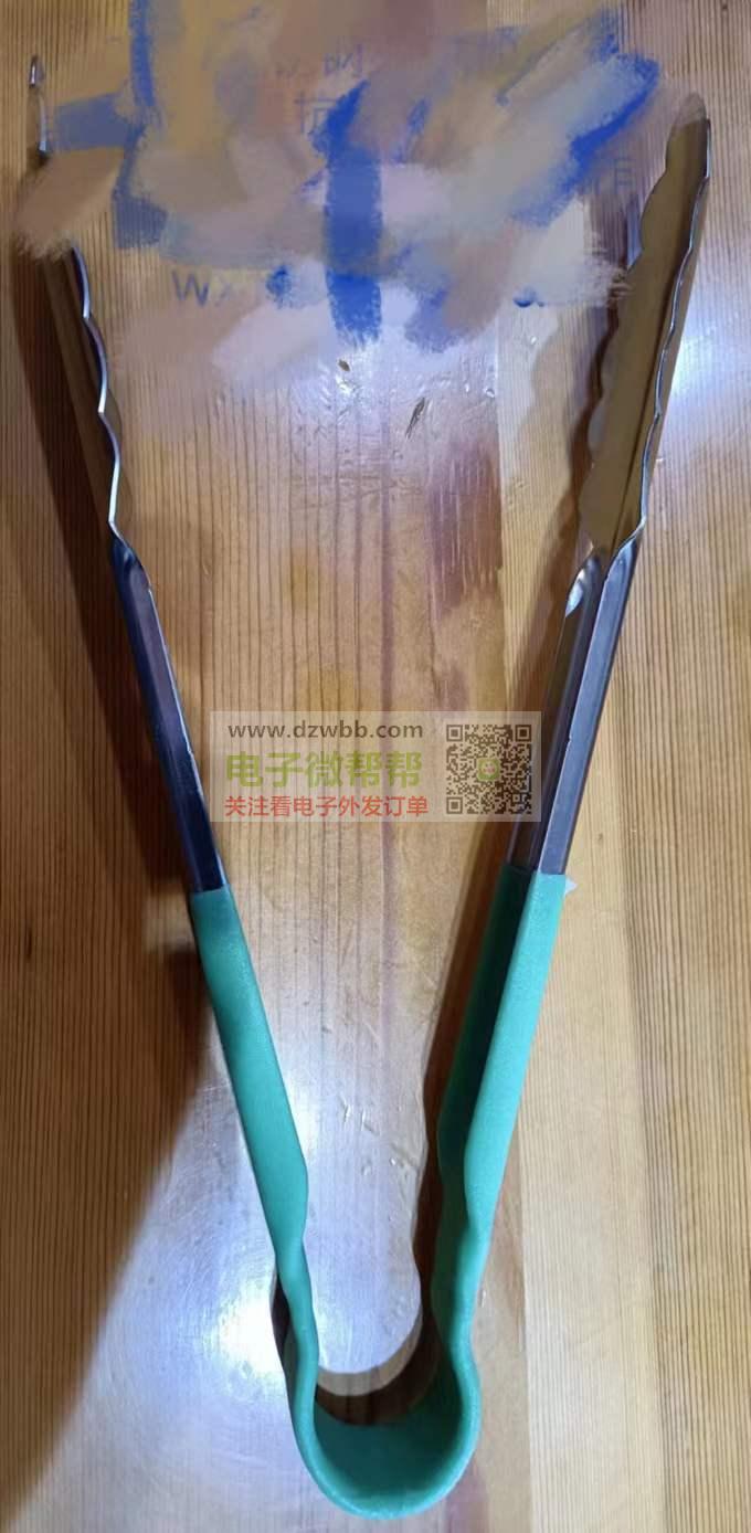 求购:25cm不锈钢夾子,如相近图示,能具抗熱的黑色或绿色包胶把柄,印单色字符,作