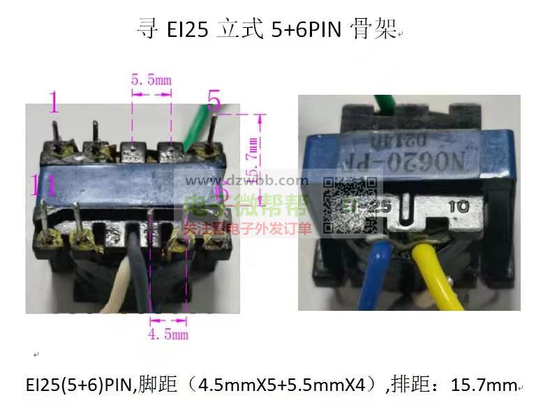 寻EI25 立式5+6PIN骨架,EI25(5+6)PIN,脚距(4.5mmX5+5.5mmX4),排距:15.7mm。有的请联系